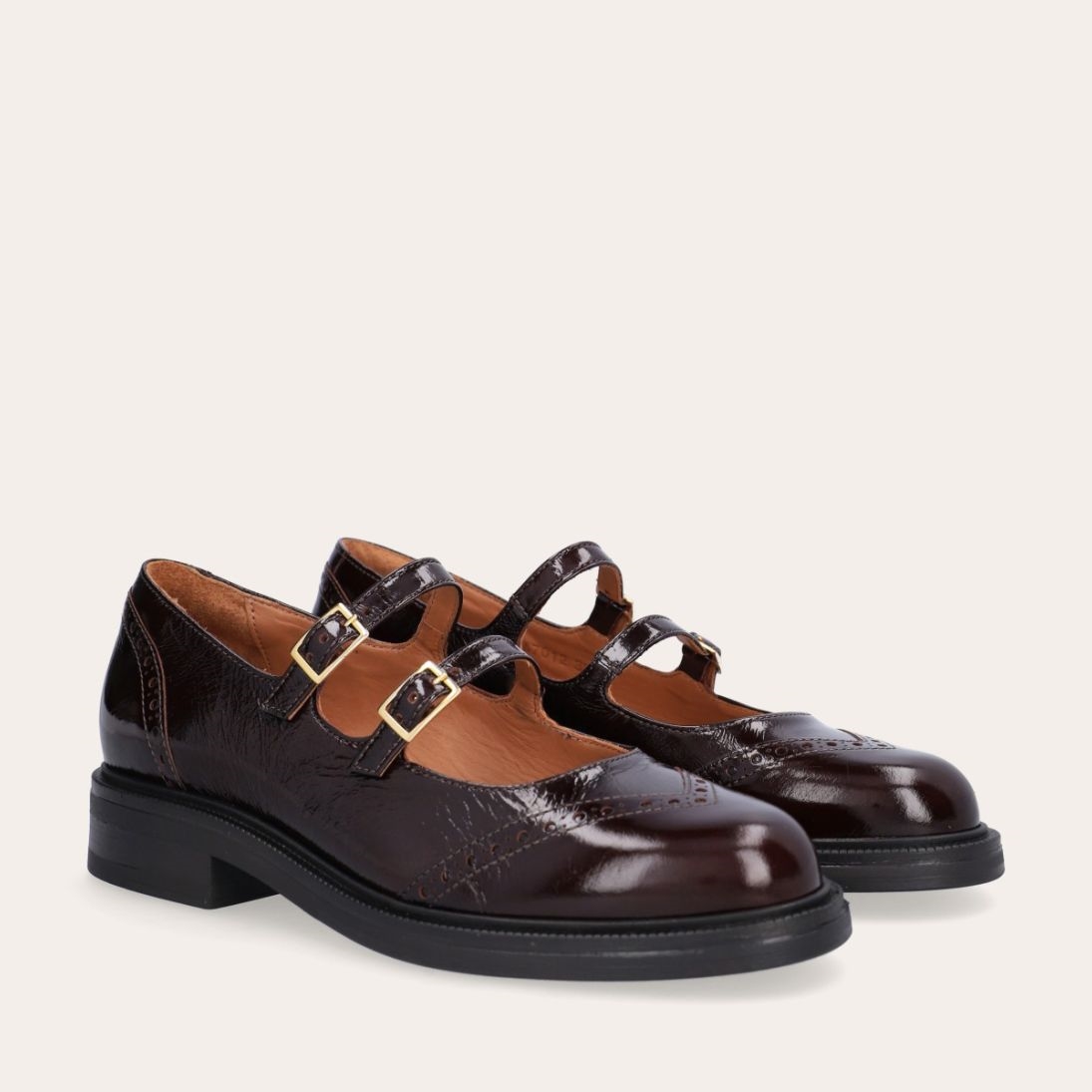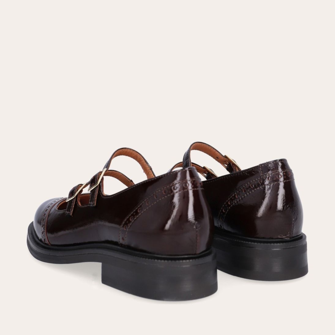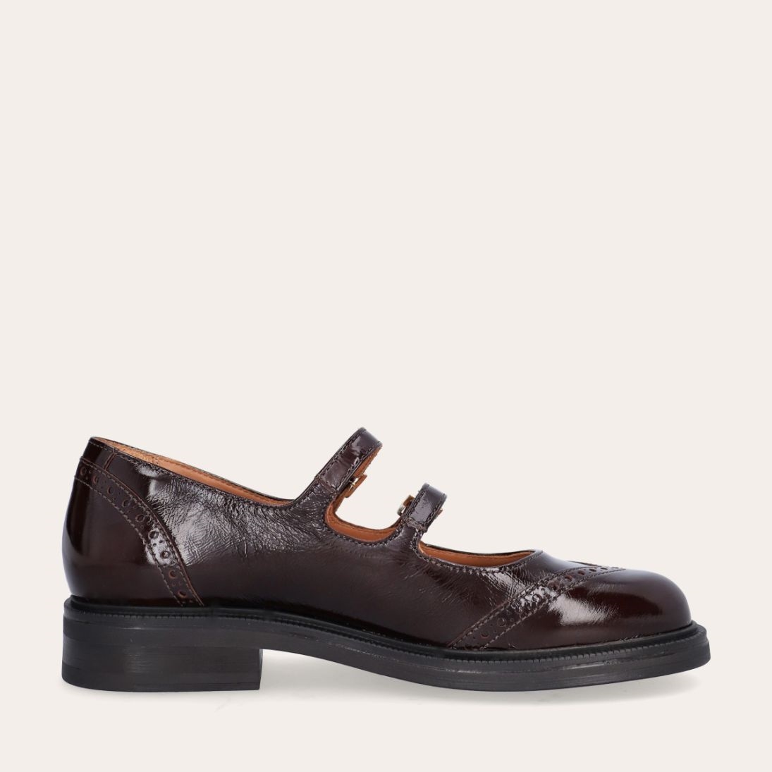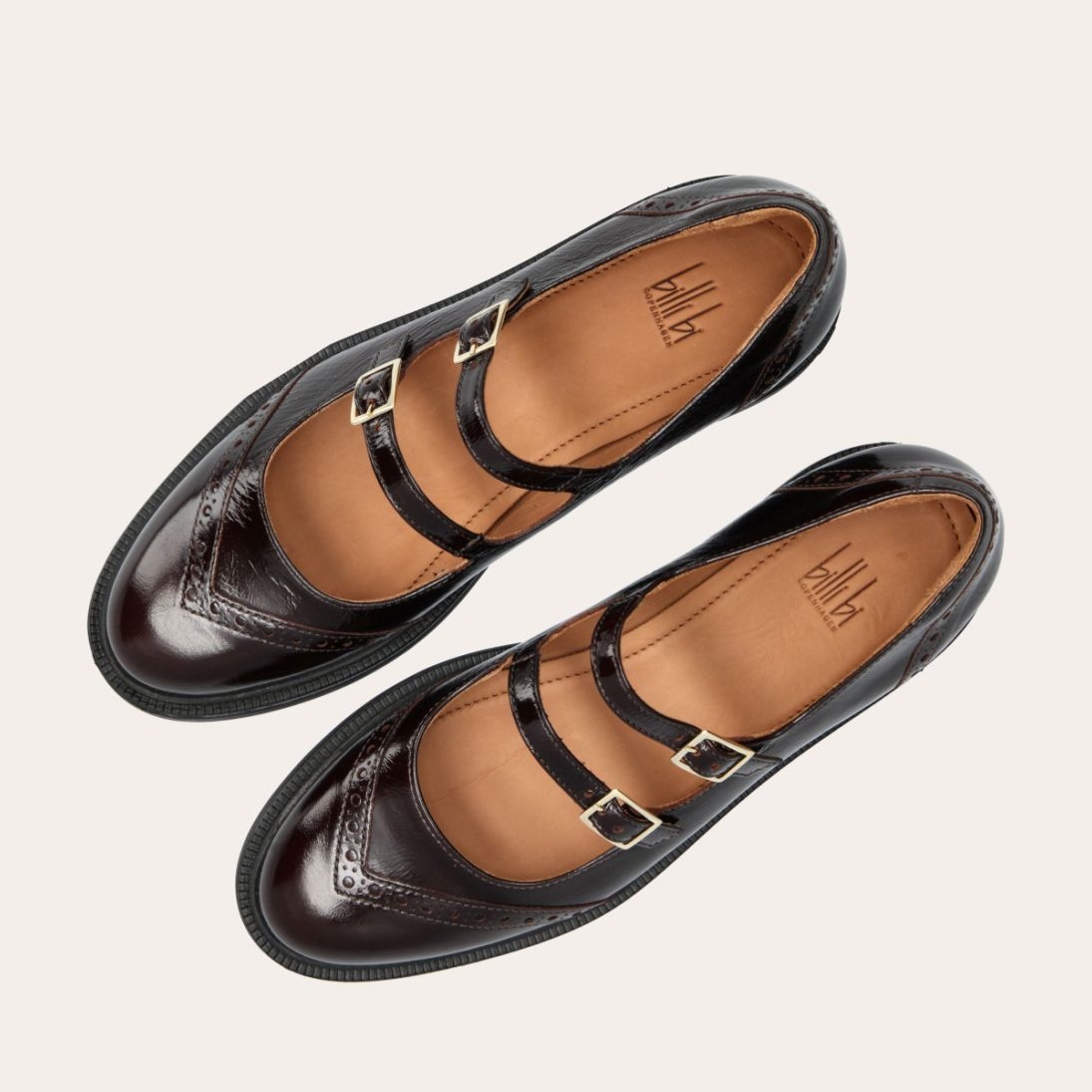 Håndlavet Mary Jane sko. Ballerinaen er skabt i lakeret skind med rund tå. Den er en lækker kastanje-bordeaux varm farve. Ballerinaen er designet med brogue på fronten af skoen, den har to stropper henover forfoden, som lukkes med små gyldne spænder og tilpasses nemt efter eget behov.