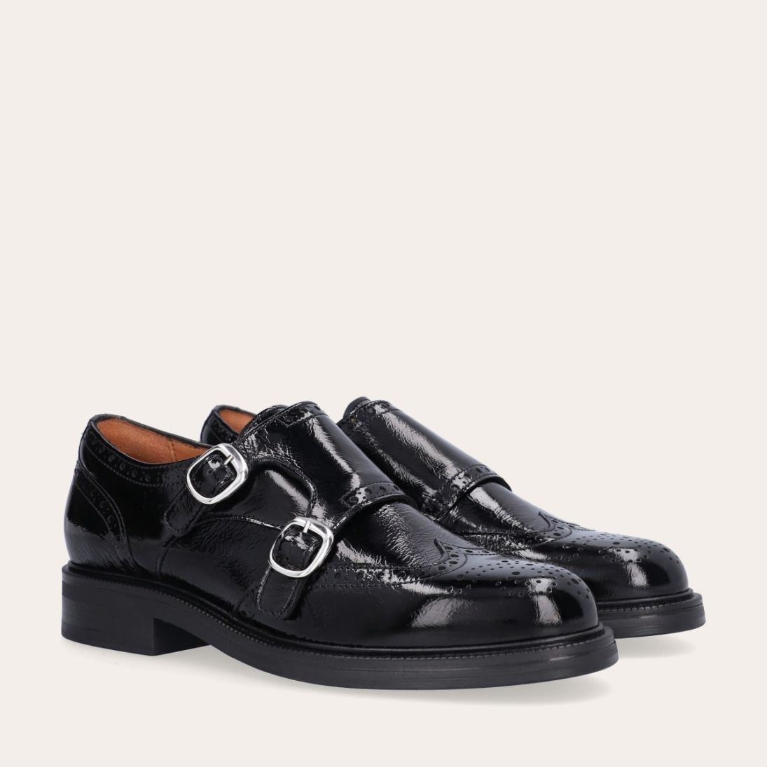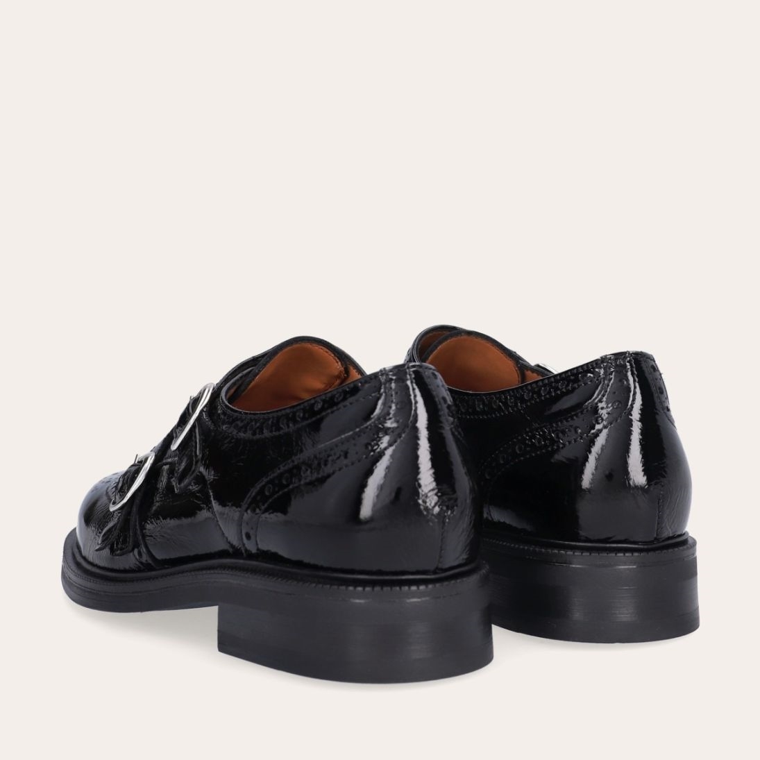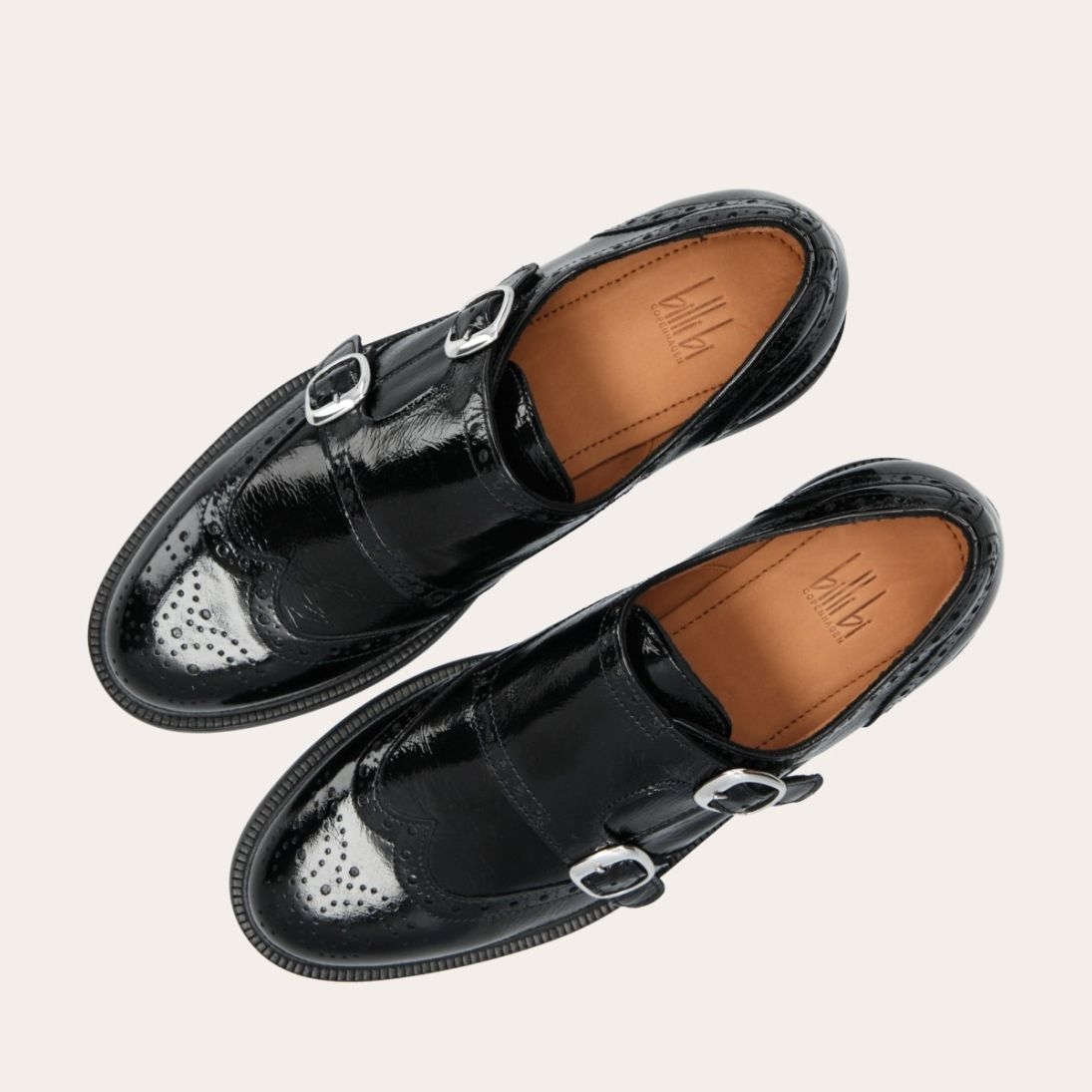 Håndlavet loafer fra billi bi. Loafersen er skabt i  lakeret skind med rund tå. Skoen er udsmykket med en dobbelt monk strap hen over vristen, der lukkes med lækre sølvspænder. Den er er designet med brogue.