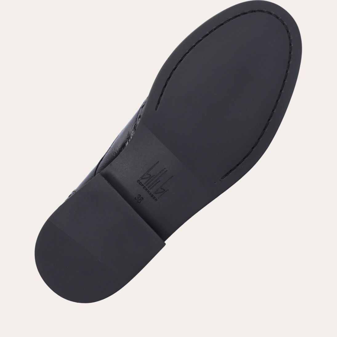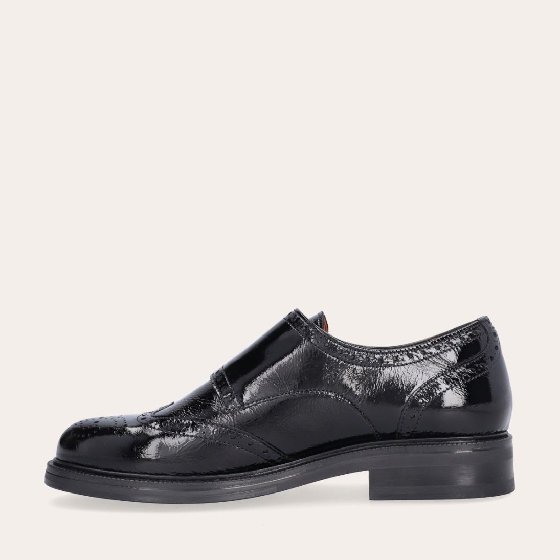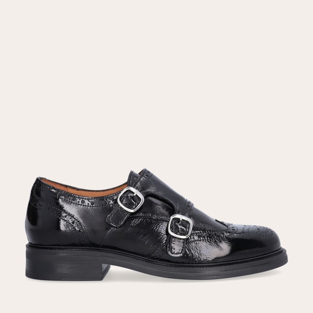 Håndlavet loafer fra billi bi. Loafersen er skabt i  lakeret skind med rund tå. Skoen er udsmykket med en dobbelt monk strap hen over vristen, der lukkes med lækre sølvspænder. Den er er designet med brogue.