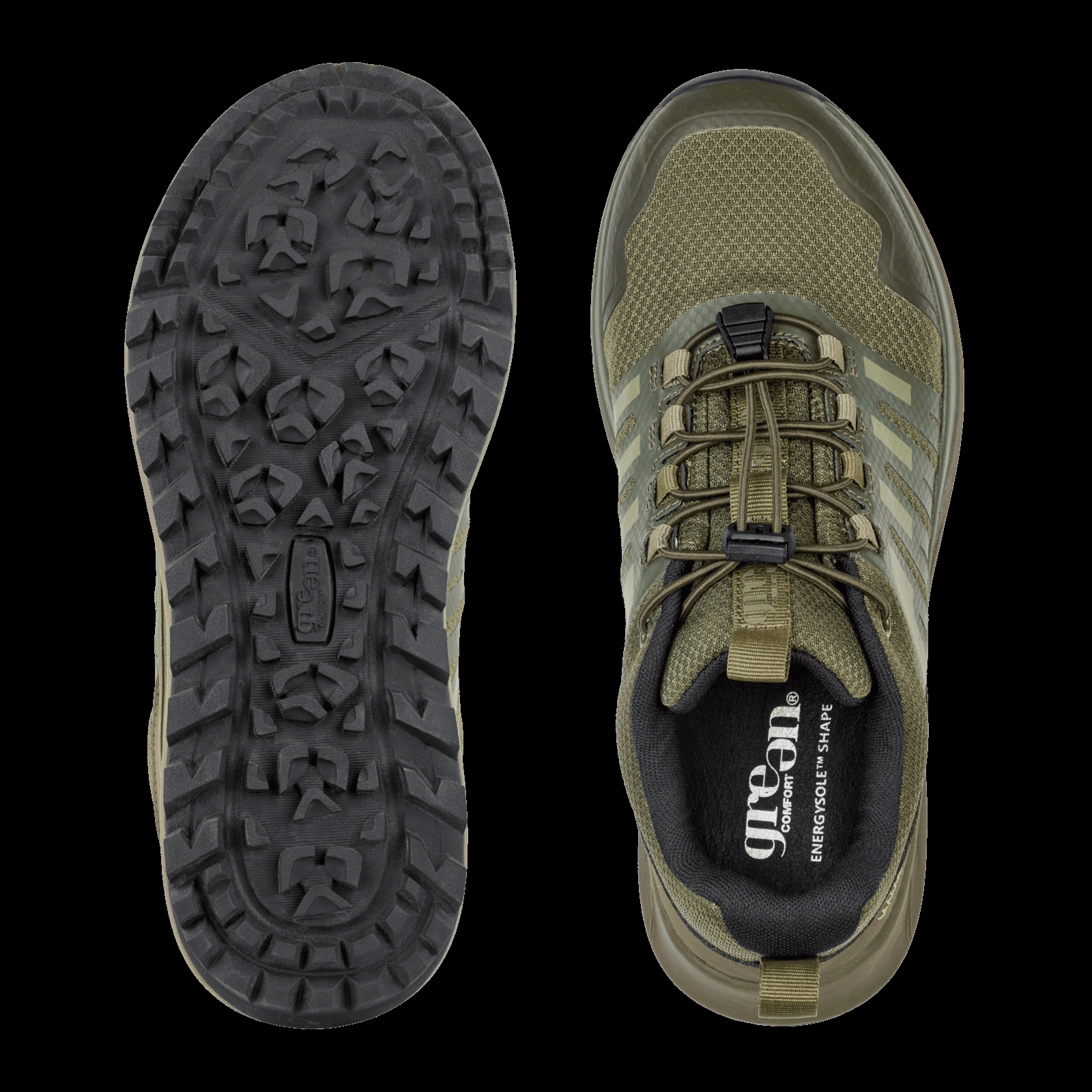 Olive grønne outdoorsko fra Green Comfort. Med udtaglig 4,5 mm EnergySole™ Shape indlægssåler med indbygget svangstøtte. Udersålen er lavet af letvægtsgummi der også giver skoen et godt greb. Skoen har en membran af GreenTex, det gør skoen åndbare og overmaterialerne vandtæt