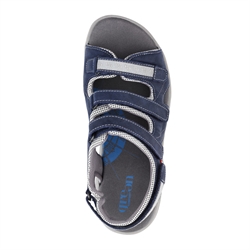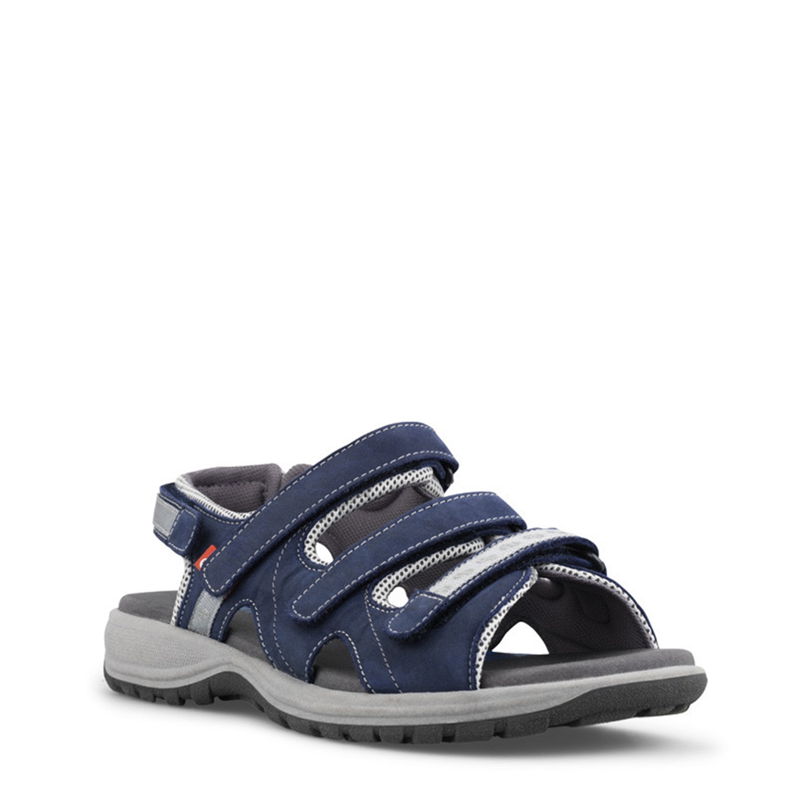 Smart og komfortabel Green Comfort sandal i farven, marineblå. Sandalen er ydermere lavet af blødt skind, og den består af tre velcroremme over forfoden, samt en velcrorem ved hælen. De fire velcroremme bidrager til, at sandalen er justerbar, så den sidder tæt og godt om foden.