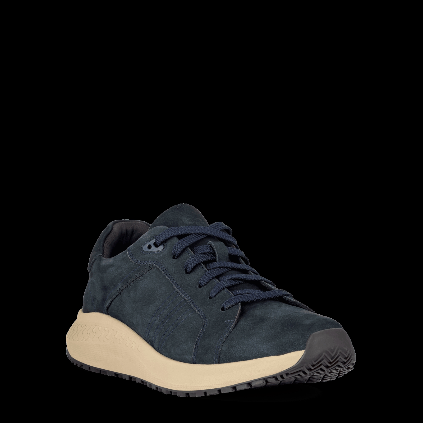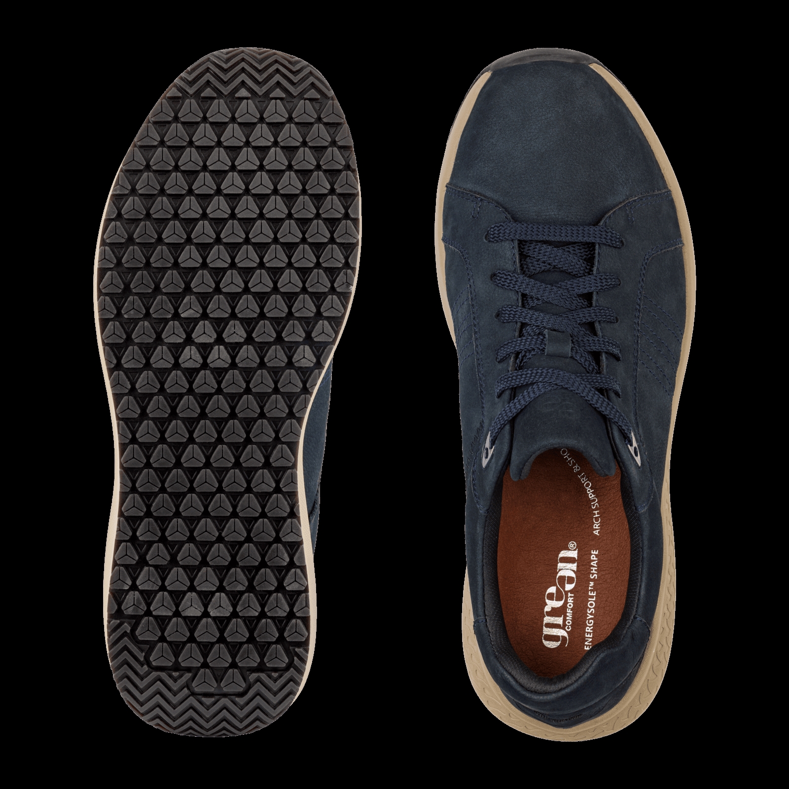 Marine blå Vigo Vito sneakers i ruskind fra Green Comfort. Skoen er med snørebånd, hvilket gør det nemt at tilpasse skoen efter behov. Den har en udtagelig 4,5 mm EnergySole Shape indersål med svangstøtte.