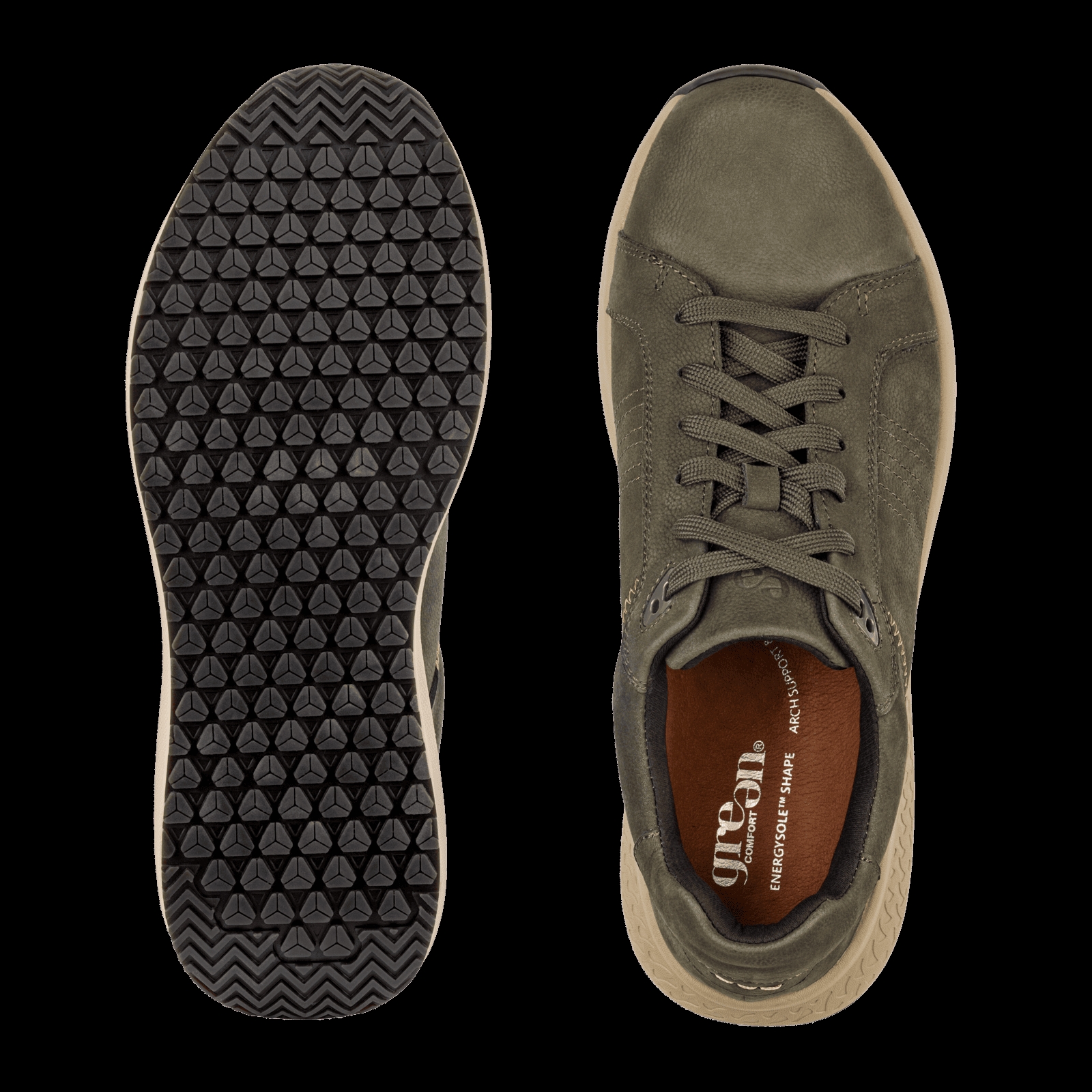 Olive grønne Vigo Vito sneakers i ruskind fra Green Comfort. Skoen er med snørebånd, hvilket gør det nemt at tilpasse skoen efter behov. Den har en udtagelig 4,5 mm EnergySole Shape indersål med svangstøtte.