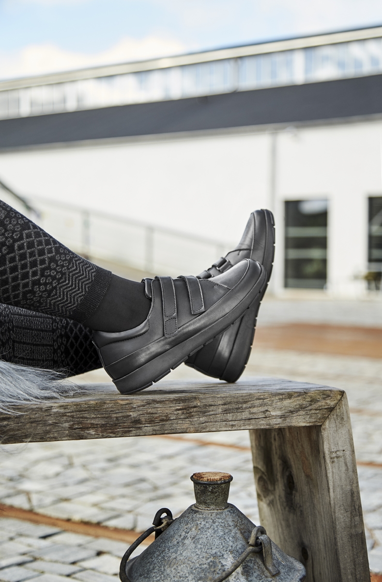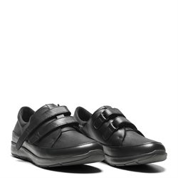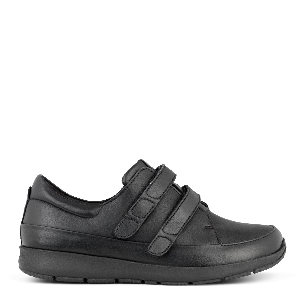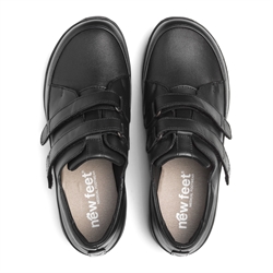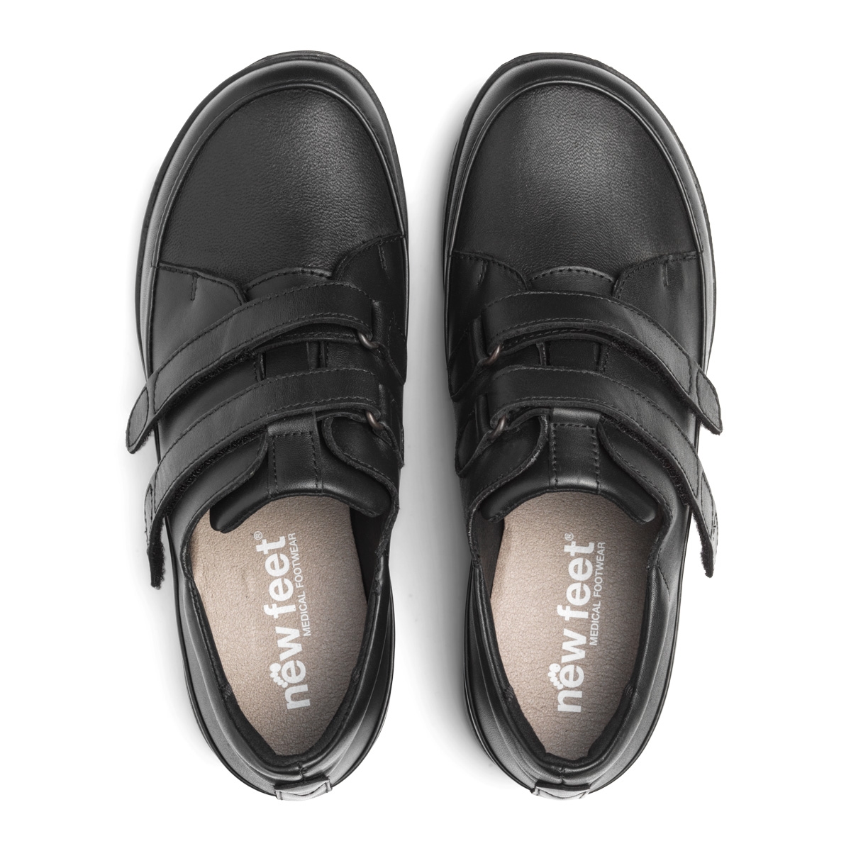 Ideel sort damesko fra New Feet, med velcrostropper, der kan tilpasses efter behov. Skoen er udstyret med en udtaglig 6 mm stødabsorberende Protektor®-indersål samt en TR ydersål. Skoen er i lækkert læder med OrthoStretch®.