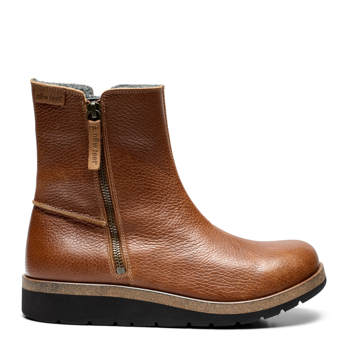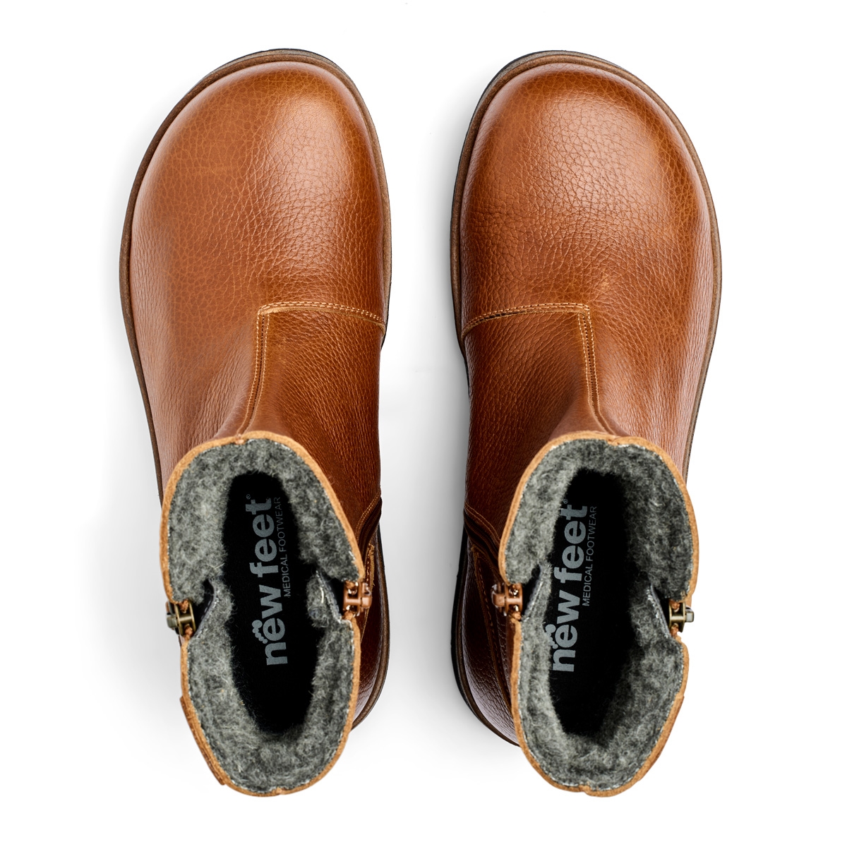 Lækker brun læder New Feet med lynlås i begge sider, Picos©-for med vandafvisende TEX-membran. Støvlen er udstyret med en let udtaglig 6 mm stødabsorberende Korrektor® Soft-indersål med svangstøtte. Samt en TR ydersål med medium rocker-funktion.