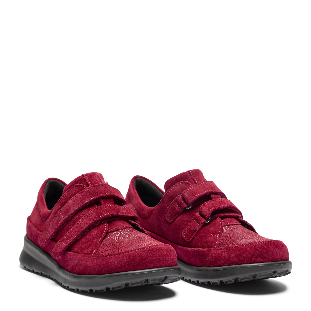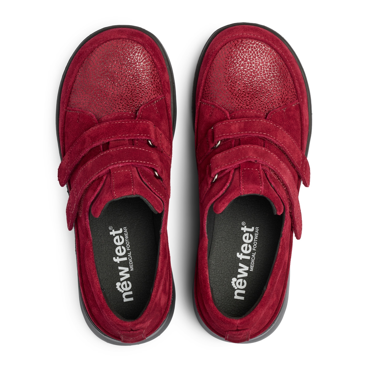 Mørk/Suide vin damesko fra New Feet, i ruskind. Skoene er udstyret med 2 velcrostropper, der gør det nemt at tilpasse til eget behov. Skoens indersål er en let udtaglig 6 mm stødabsorberende Protektor® og ydersålen er en slidstærk EVA.