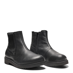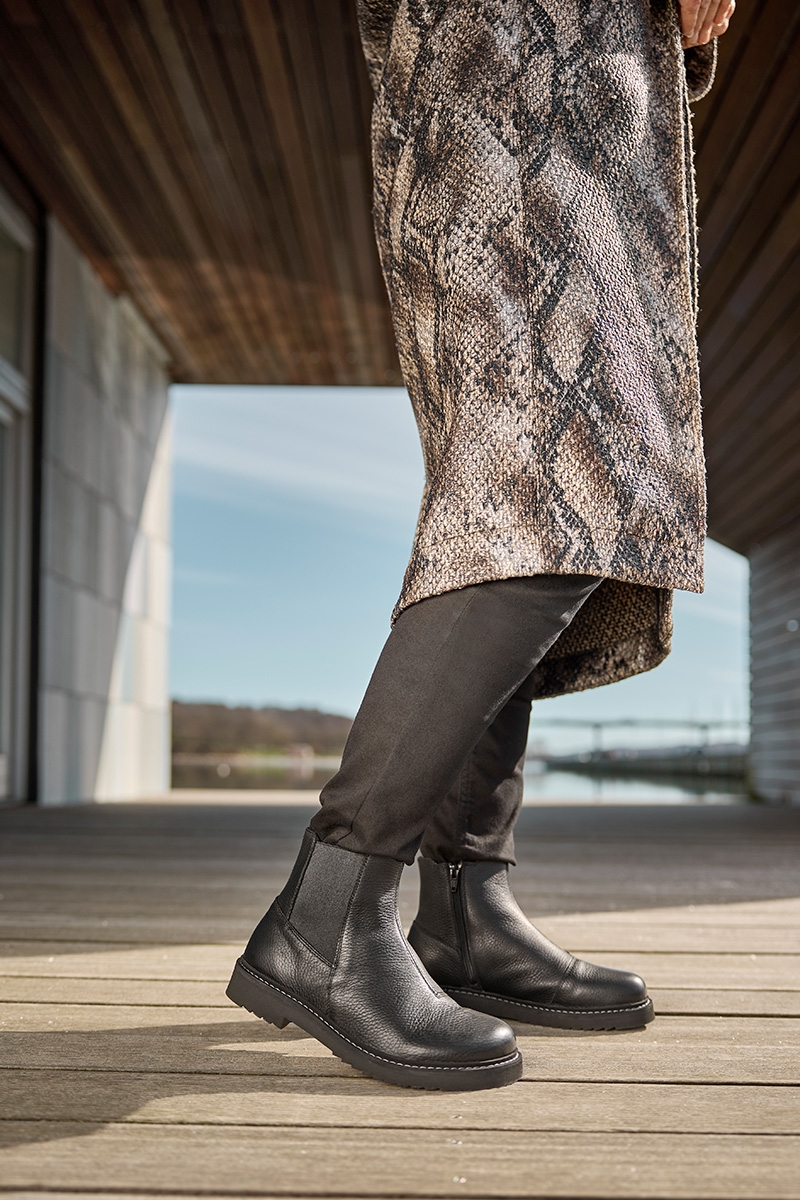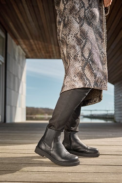Sort damestøvle med elestik i siderne, lynlås samt tekstilfor med vandafvisende TEX-membran. støvlen har et lækkert læder look.