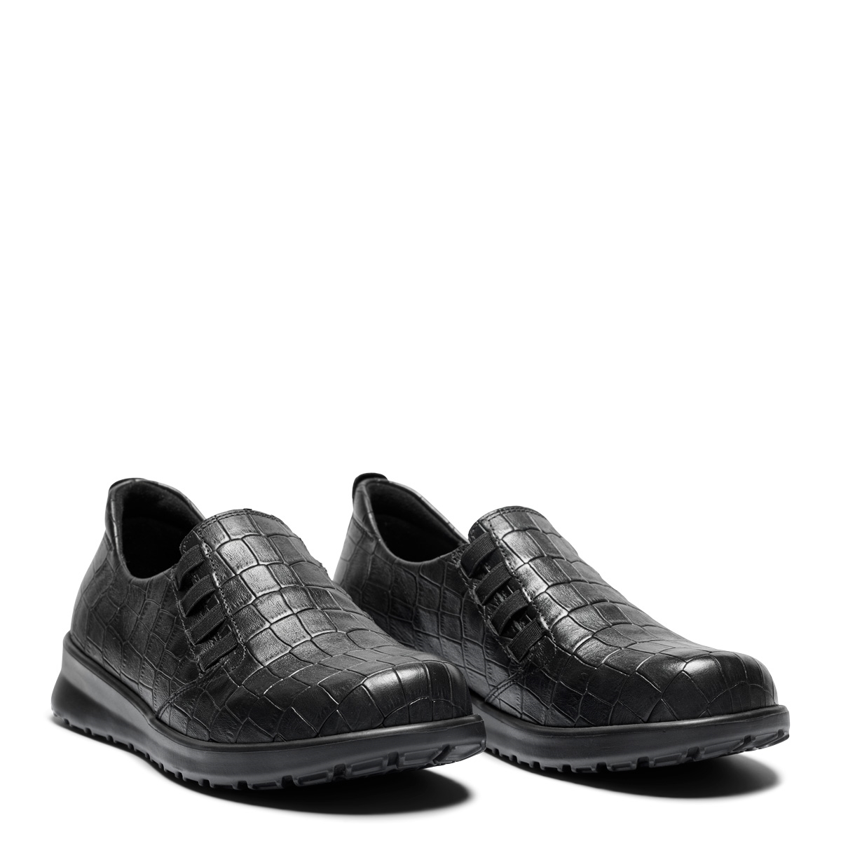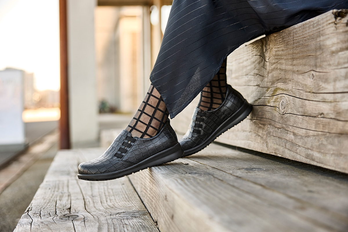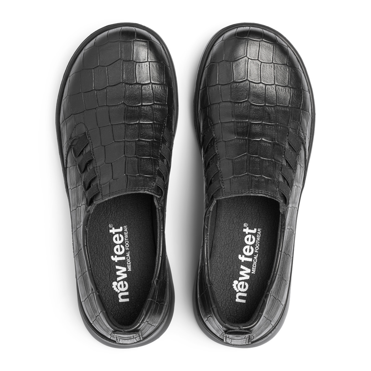 Super lækker loafer fra New Feet. Denne sko er med elastik i siden så den er nem at hoppe i. Den har en 6 mm Protektor indersål med stødabsorbering, den er udtagelig hvis man ønsker egne indlæg. Den er lavet på læst W 62, så den er dejlig bred.. Den er lavet i skind med tekstur. Indersålen hjælper med at forebygge belastningsskader i ryg, hofte og led. New Feet er egnet til dem med gigt, diabetes, hammertær og knyster.