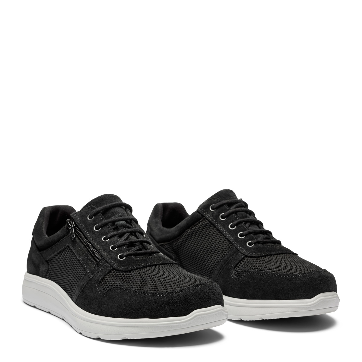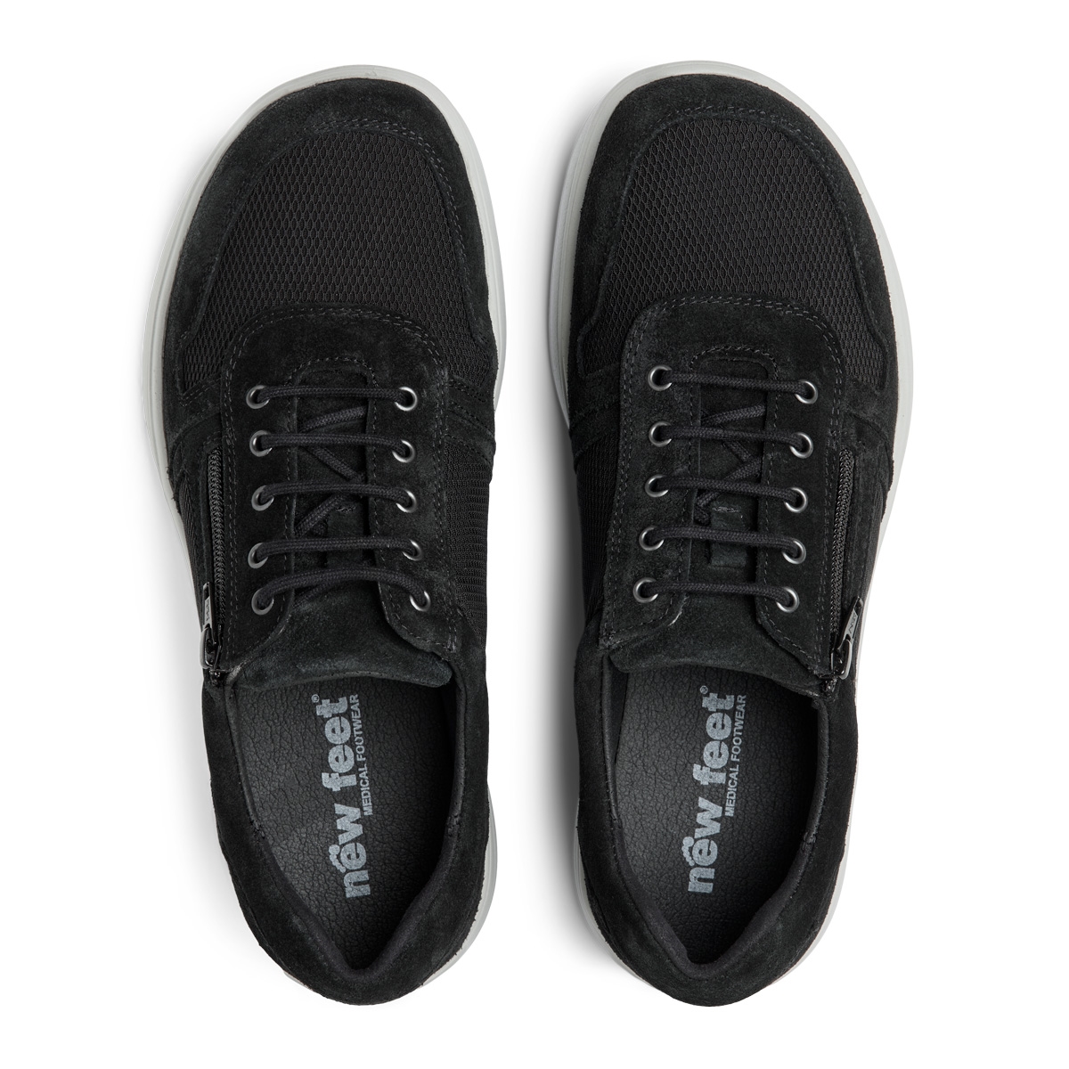 Sorte Herre sko i mesh og skind til lange travle hverdage. Skoen er udstyret med overdel i mesh tekstil, hvilket gør at skoen både er lette for fødderne at ånde i samt giver et sporty look. Skoen er udstyret med både snørebånd og lynlås til farten. Samt udtaglige såle.