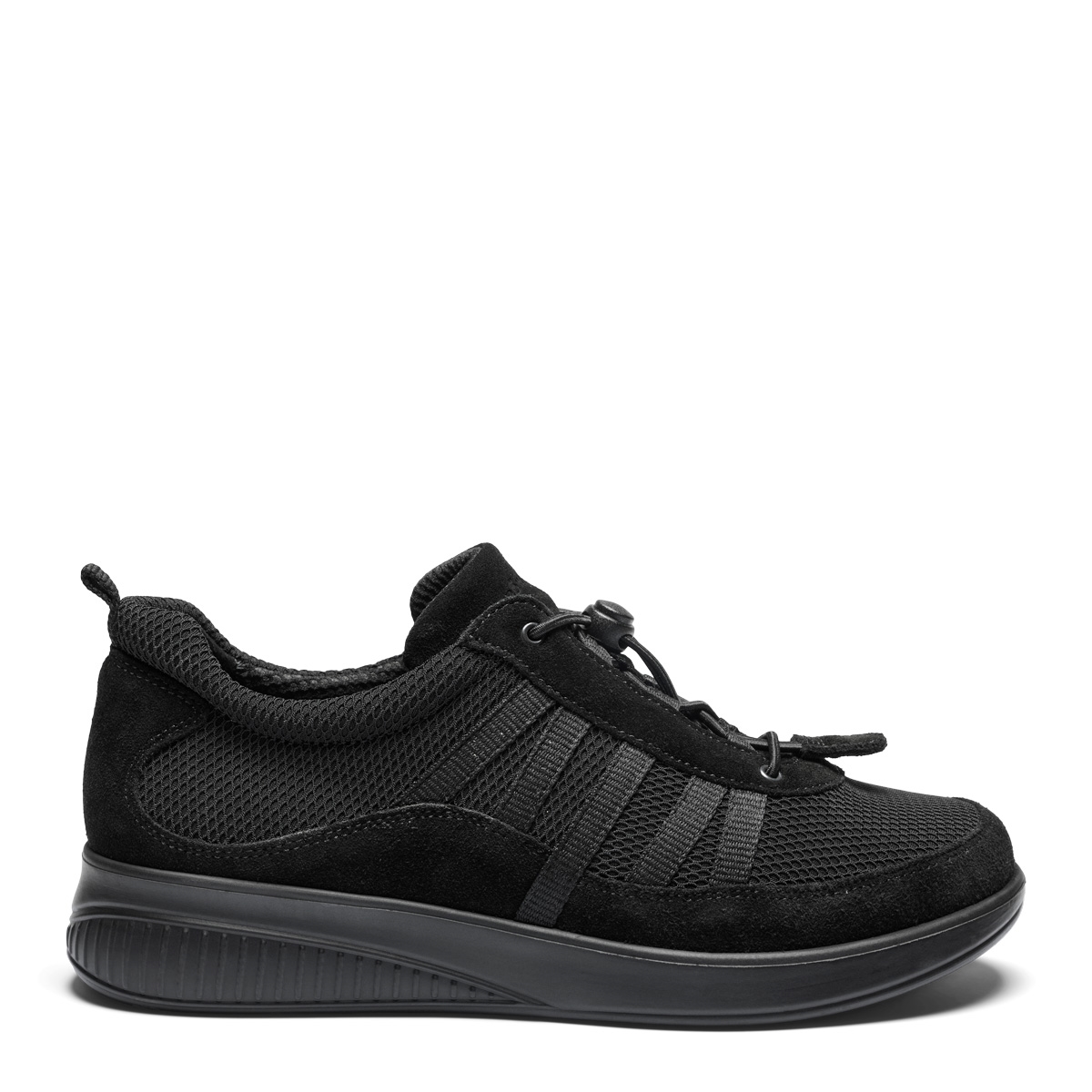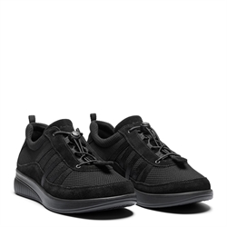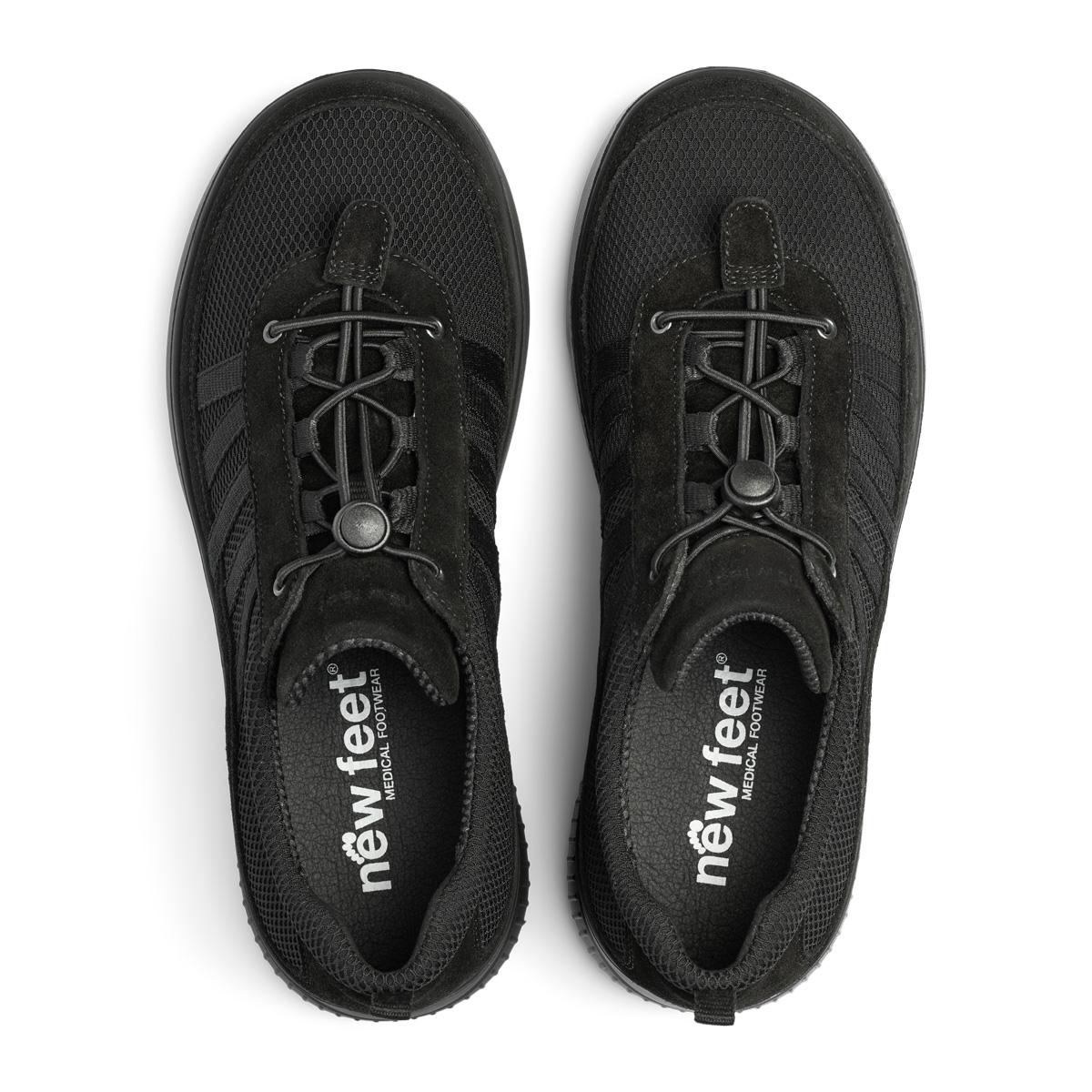 Sort damesneaker fra New Feet til den spoty. Let tilgængelig, med elastiske snørebånd. Indersålen er en let udtaglig 6 mm stødabsorberende Protektor®-indersål. Ydersålen er lavet af EVA, som er et sildstærkt materiale med medium rocker-funktion.