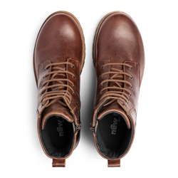 Brun damestøvle fra New Feet, med snørebånd og lynlås. I et åndbart materiale On-Steam®-for. Støvlen er udstyret en let udtaglig 6 mm stødabsorberende Protektor®-indersål, samt en TR ydersål.