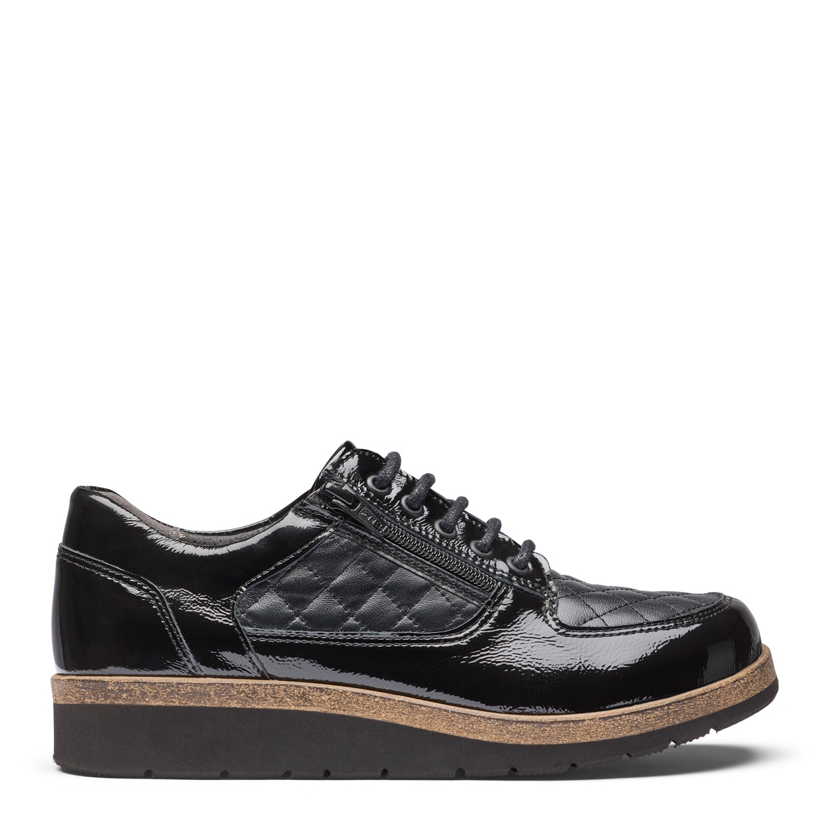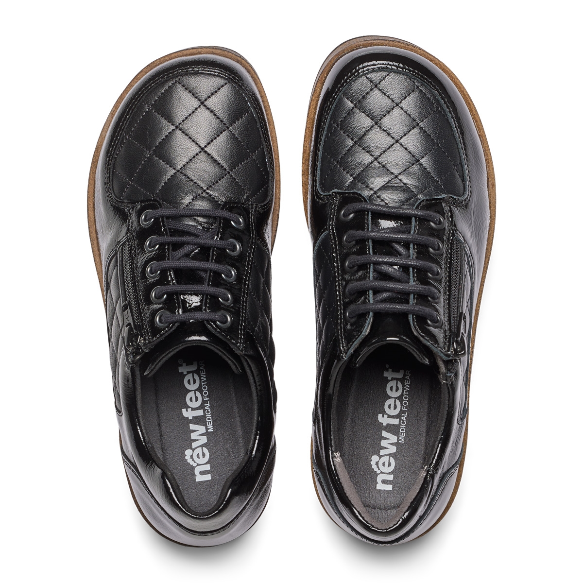 Lækker New Feet damesko i skind, med snøre og lynlås med flotte lak detaljer. med OrthoStretch® over forfoden. Skoen har de bløde stødabsorberende udtagelige 6 mm korrektor® Soft indlægssåler med svangstøtte, der skåner dine led, hofter og ryg - du kan også benytte dit eget indlæg i skoen, så kan du fjerne de udtagelige såler.