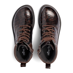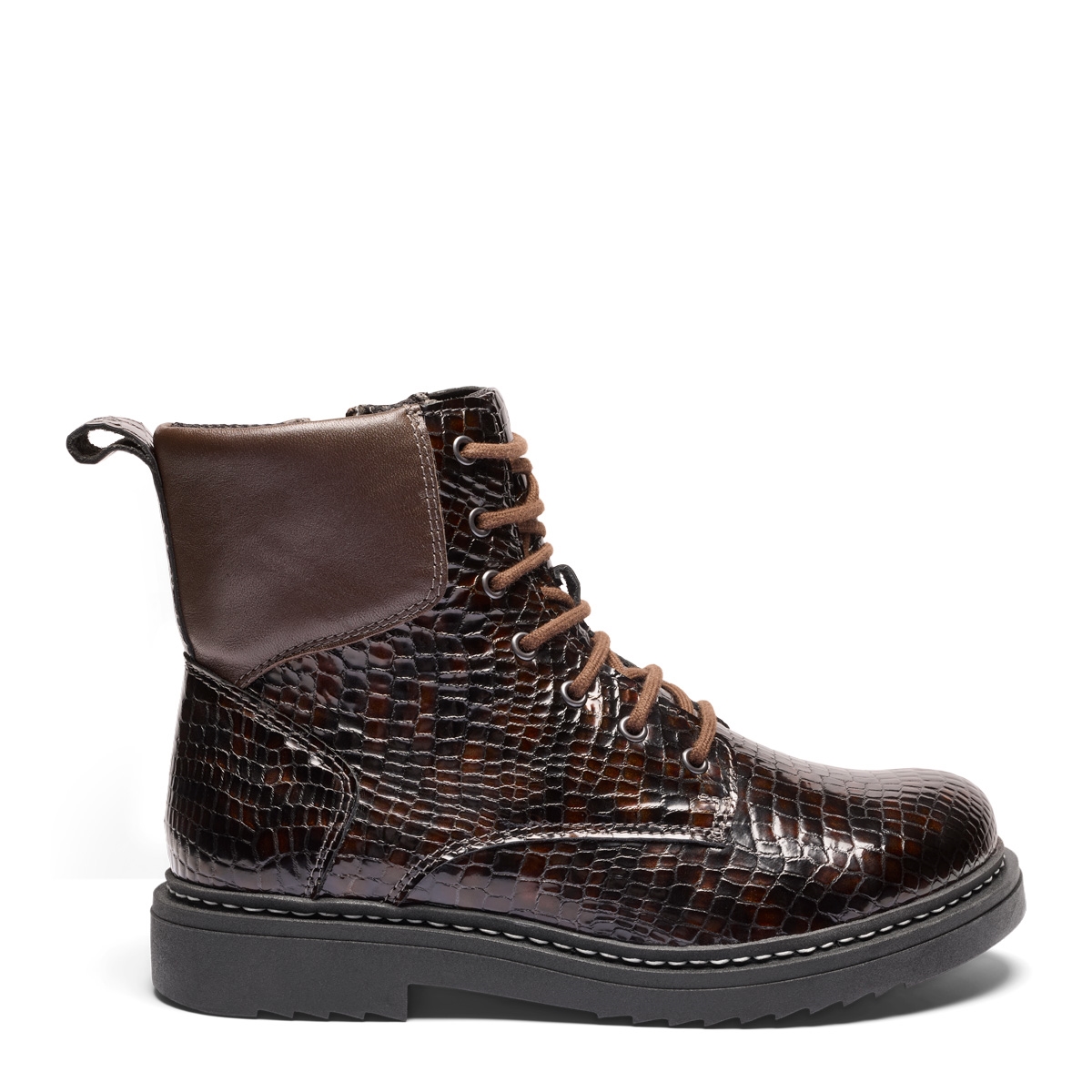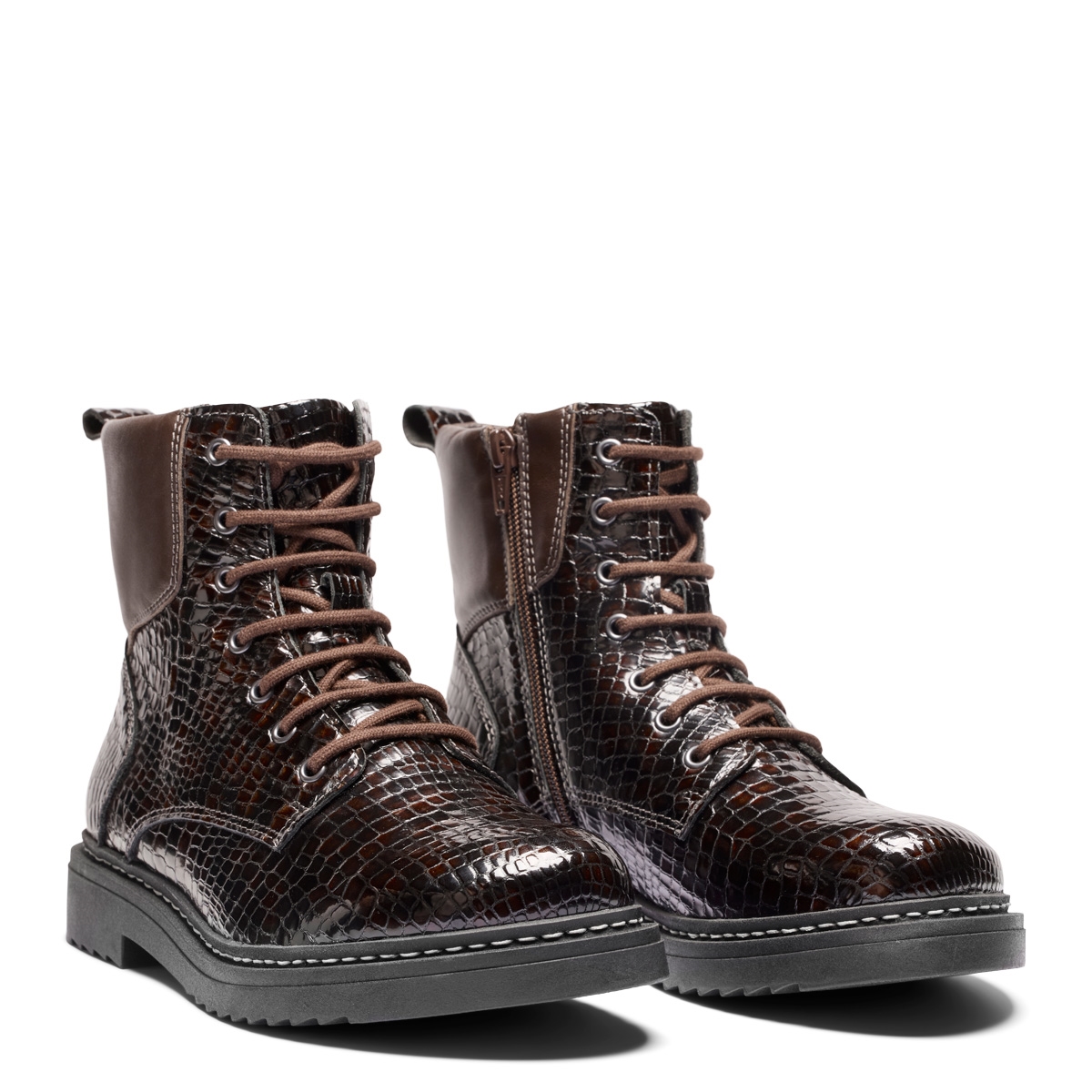 Brune damestøvler med snørebånd og lynlås, tekstilfor med en vandafvisende membran. Læder støvler med lækkert print. Støvlen har en let udtaglig 6 mm stødabsorberende Protektor®-indersål, samt en TR ydersål.