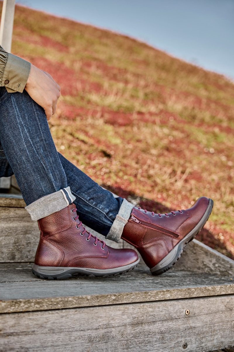 Varm mørk vinrød støvle fra New Feet. Støvlen har både snørebånd og lynlås. Samt Picos©-for og en vandafvisende TEX-membran. Støvlens ydersålen er TR med en let rocker-funktion og indersålen er en 6 mm udtaglig stødabsorberende Protektor®.