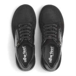 Utrolig smart New Feet sko i Ruskind i farverne sort og jeansblå. Skoen har snørebånd samt en lynlås i siden, der ikke kun gør skoen endnu smartere, men bidrager til at den er lettere at få af og på foden.