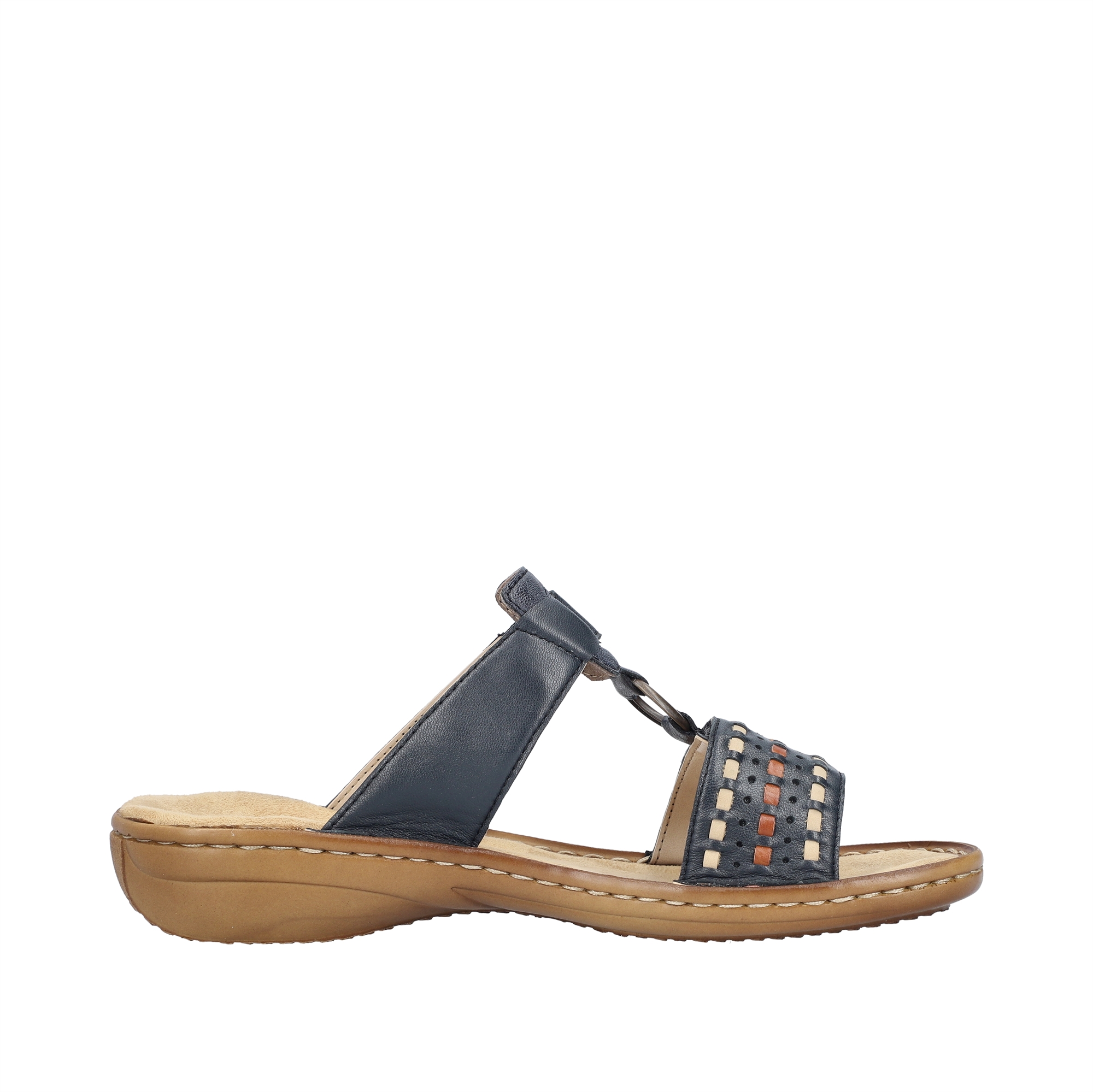 Super fin slippers fra Rieker. Denne slippers har en justerbar rem i den ene side. Den har nogle super fine detaljer. Den har en smule hæl og en rigtig lækker sål.