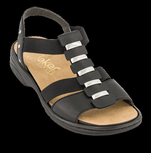 Rigtig fin sandal fra Rieker. Denne sandal har en god bredde. Den har nogle fine sølv detaljer og elastik remme.