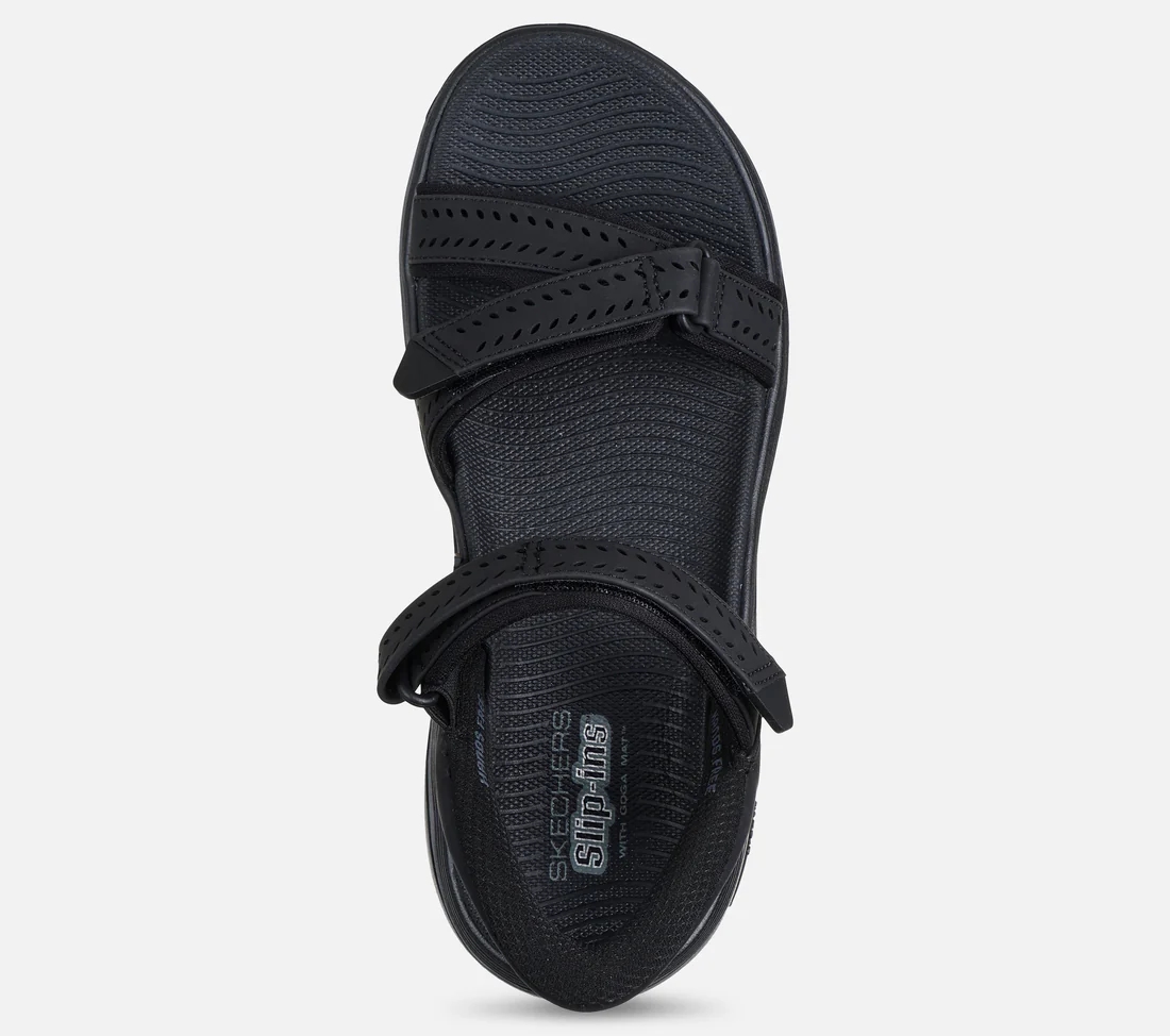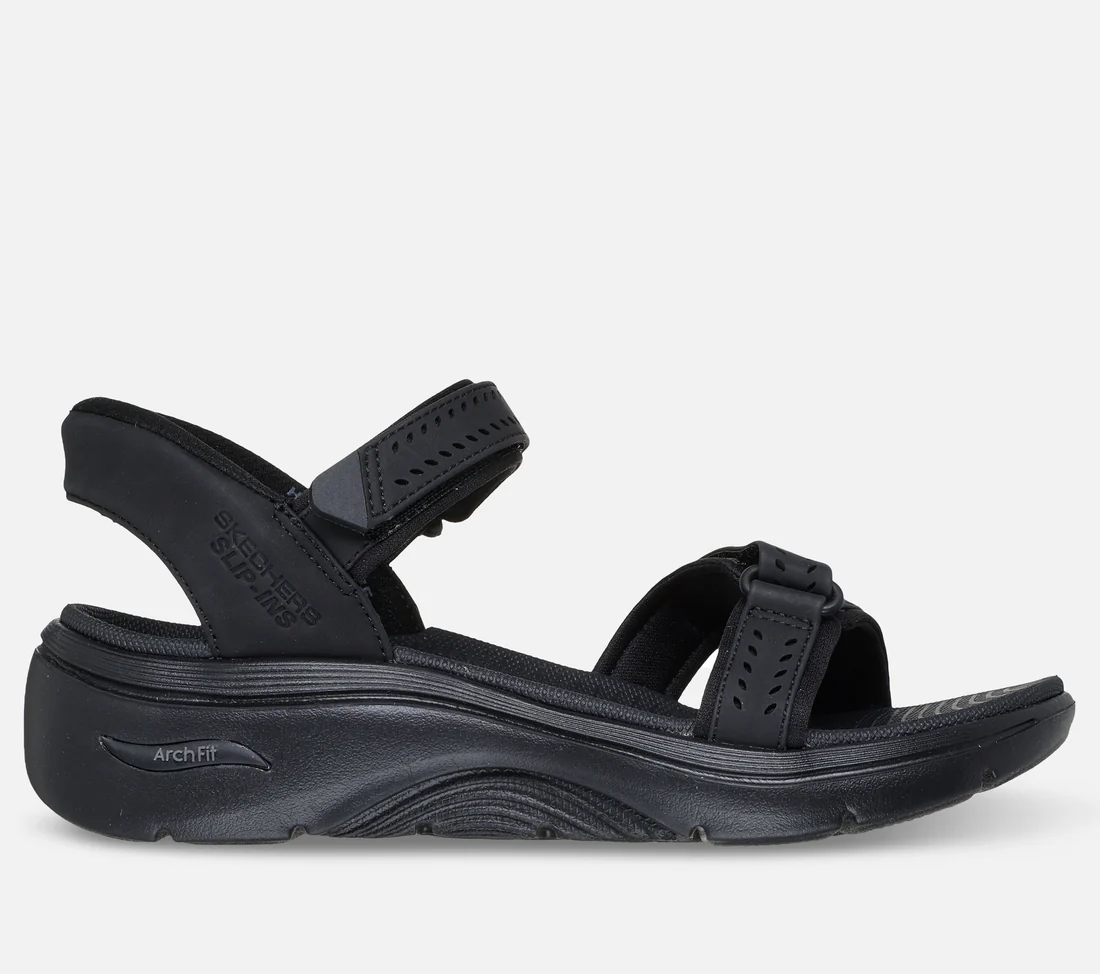 Skechers Hands Free Slip-ins: GO WALK Arch Fit 2.0 Sandal - Candace. Overdelen af sandalen har velcro, som gør det nemt og hurtigt at tilpasse efter eget behov. Sandalen har Arch Fit® indersålen som tilpasser sig efter din fød reducerer stød og har svangstøtte.